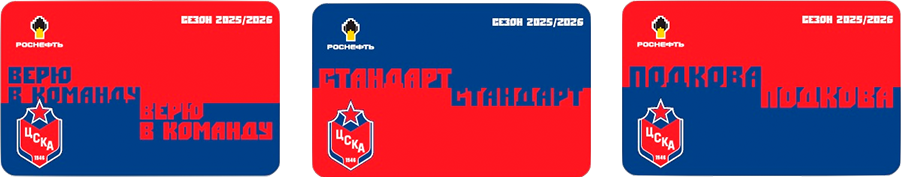 Карта с номинальной стоимостью. Даёт право всем категориям клиентов бронирования и выкупа по номинальной стоимости определенного места на трибуне на выбор потребителя на все «домашние» матчи плей-офф команды ЦСКА в сезоне 2025-2026 годов.
